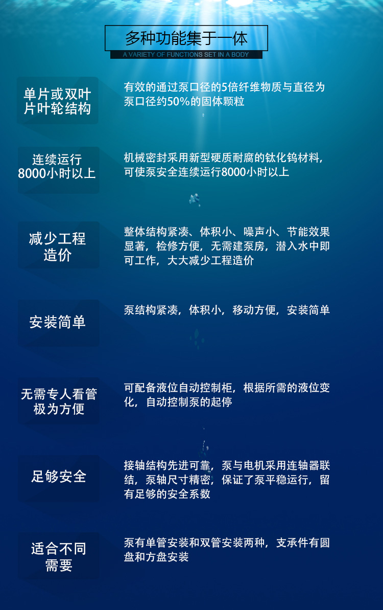 ③整體結構緊湊、體積小、噪聲小、節能效果顯著,檢修方便👨🦰,無需建泵房,潛入水中即可工作,大大減少工程造價。